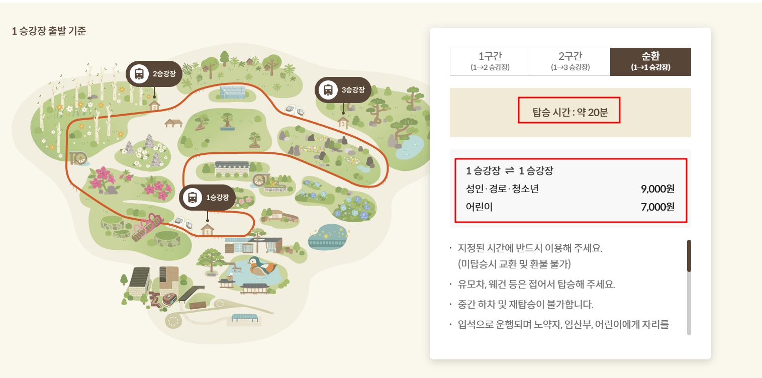 모노레일은 1승강장에서 출발해 2승강장, 3승강장을 거쳐 다시 1승강장으로 돌아오는 순환 코스를 운영합니다.