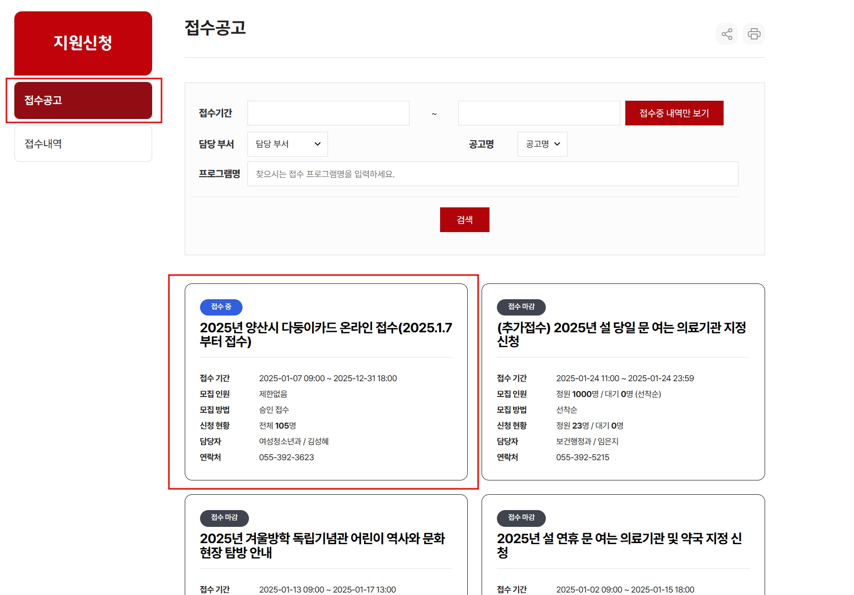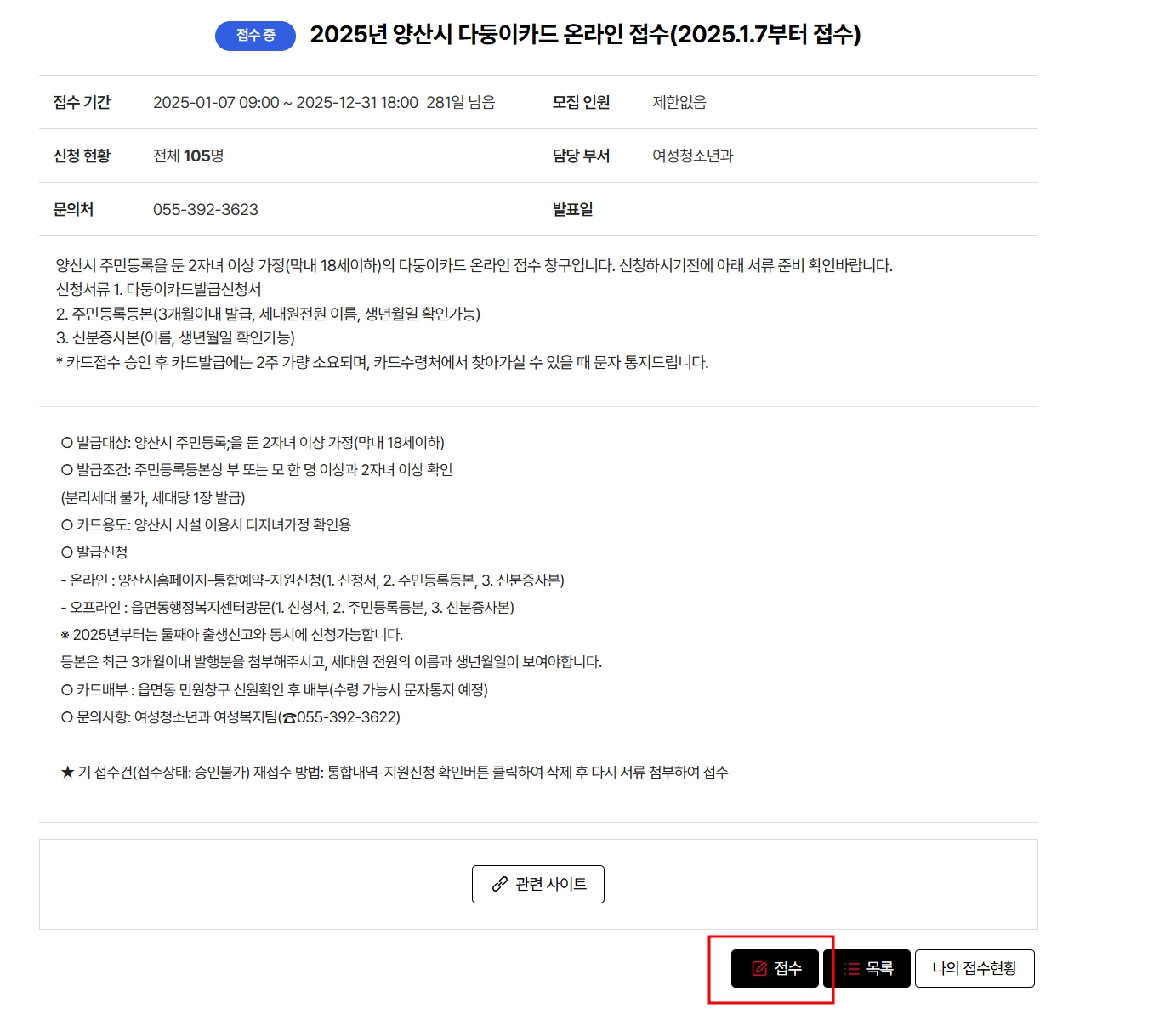 3. 양산시 다둥이카드 온라인 접수 클릭
