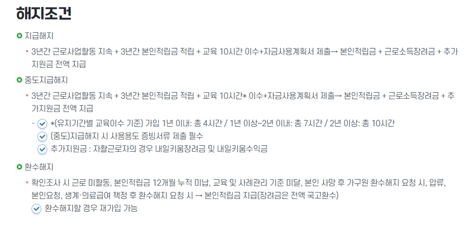 이 중 한 가지라도 미이수 시, 정부지원금은 지급되지 않으며 본인 저축액과 이자만 돌려받을 수 있으니 주의가 필요합니다.