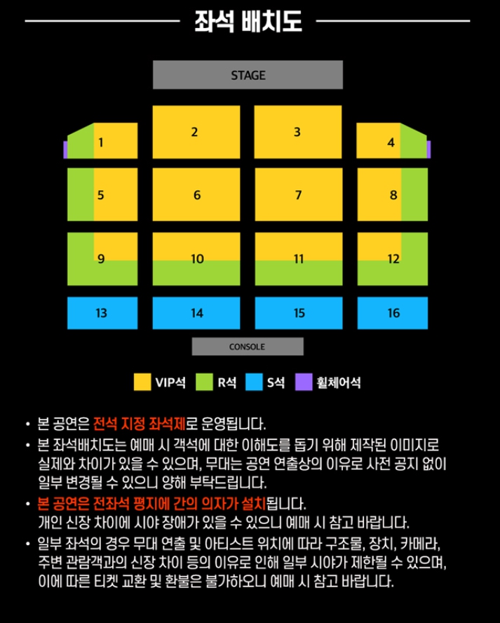 - 좌석 배치도 확인 필수 : 일부 구역은 시야 제한이 있으니 예매 전 반드시 확인