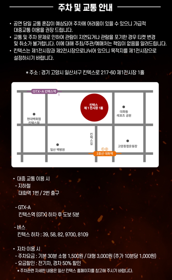 - 공연 장소 : 일산 킨텍스 제1전시장 1홀 ( 경기 고양시 일산서구 킨텍스로 217-60 (대화동 2600) )