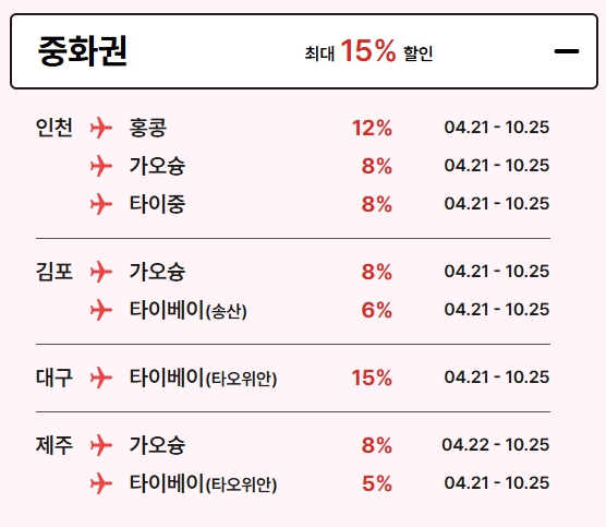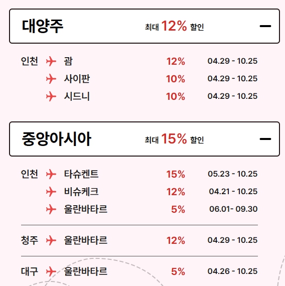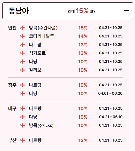 - 동남아 노선 : 같은 기간 최대 15% 할인 (일부 노선 제외)