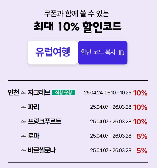 유럽으로 떠나는 분들을 위한 별도의 프로모션도 진행 중입니다.
