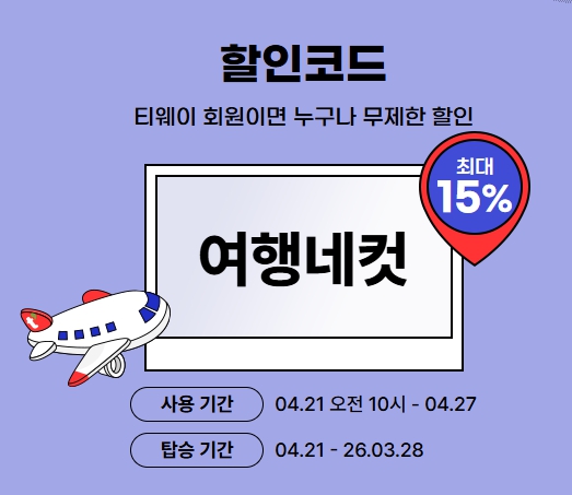 최신 프로모션 정보 및 할인코드는 티웨이항공 공식 홈페이지 이벤트/프로모션 메뉴에서 반드시 확인 후 예약하세요.