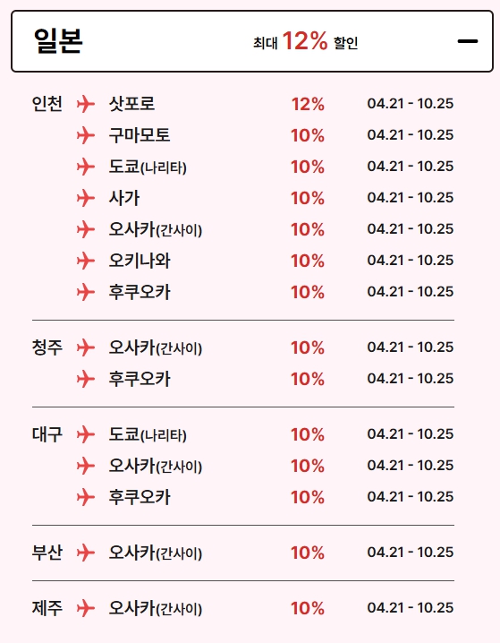 - 일본 노선 : 4월 21일~27일, 최대 12% 할인 (‘여행네컷’ 코드 입력)