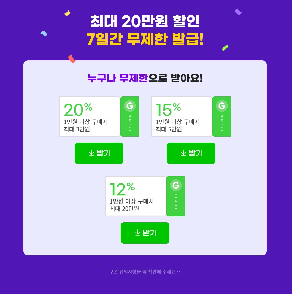 이번 빅스마일데이에서는 최대 20만 원까지 할인 가능한 12% 고액 쿠폰이 무제한 제공돼요.