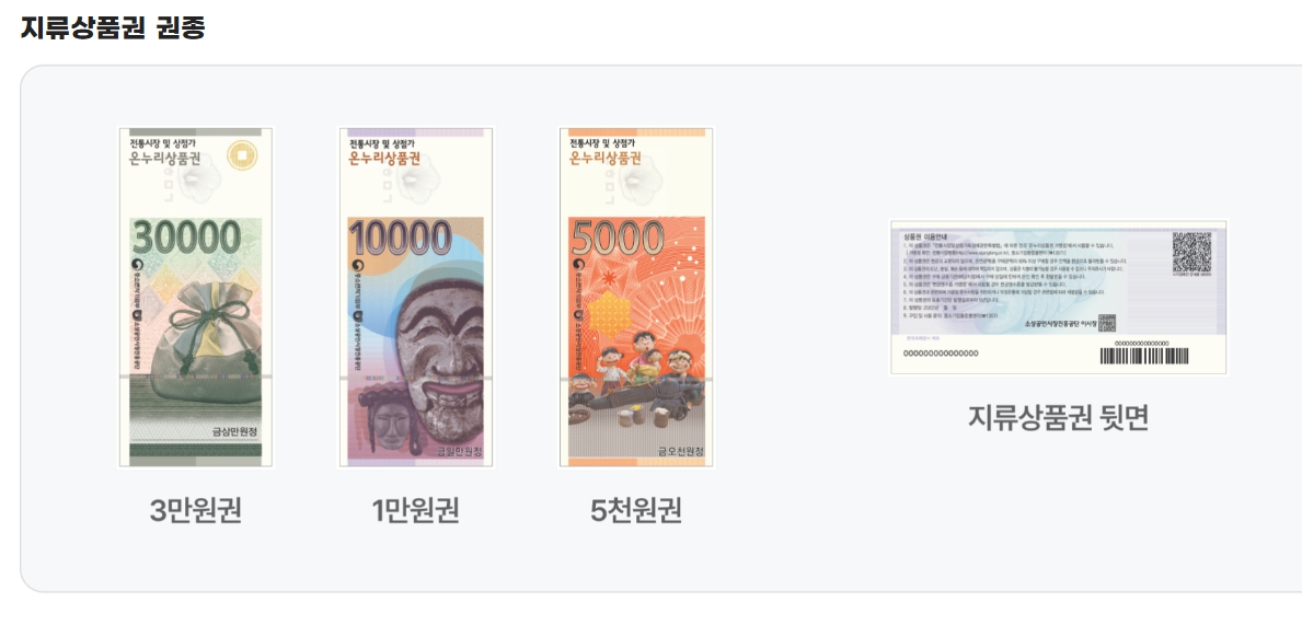 5만 원, 10만 원권 등으로 구성되며, 온누리페이 등 앱에 등록된 카드로 사용 가능. 일부 온라인 전통시장몰에서도 결제 가능합니다.