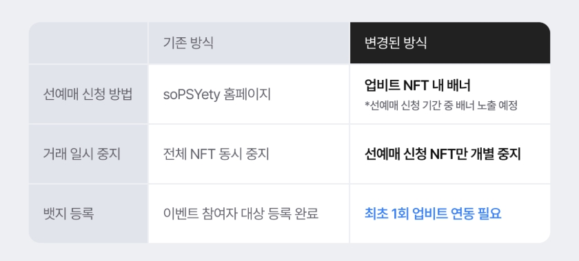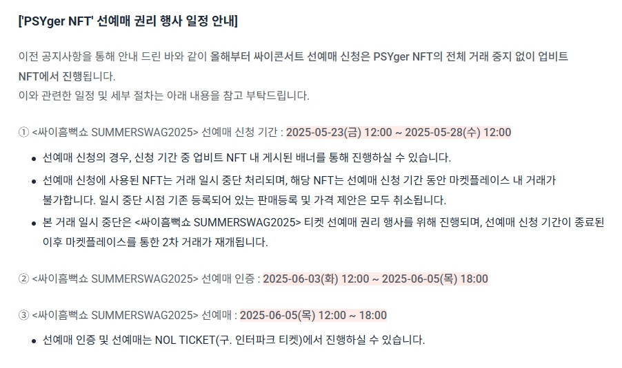 ⚠️ 선예매권 신청 시점부터 NFT 거래가 일시적으로 제한될 수 있으며, 신청 후 정보 수정이나 취소는 불가하니 신중하게 진행해야 합니다.