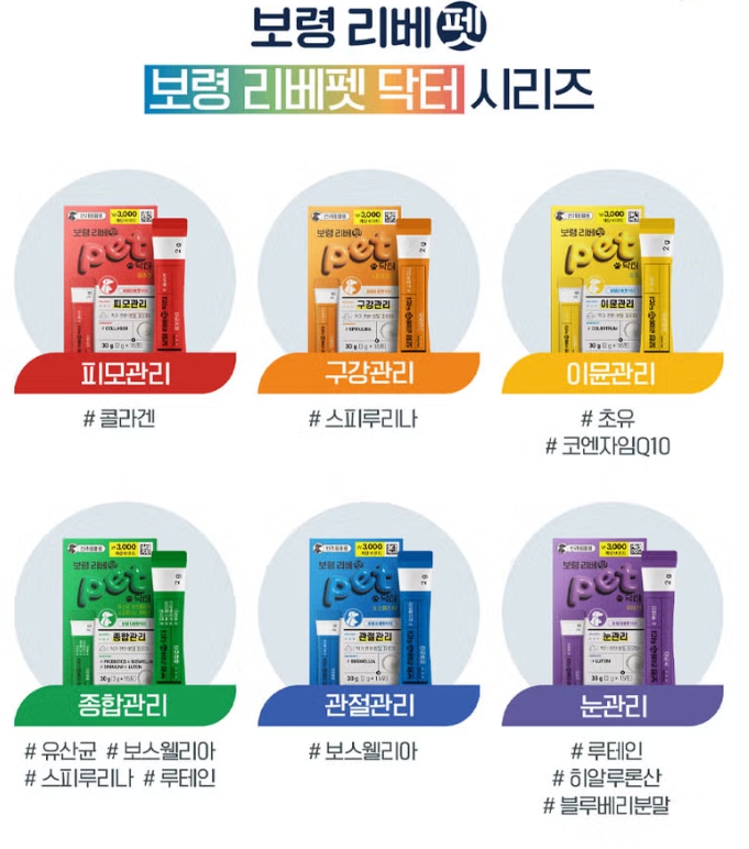 - 종류 : 종합 건강, 관절, 눈, 피모, 면역, 구강 건강 등 총 6종