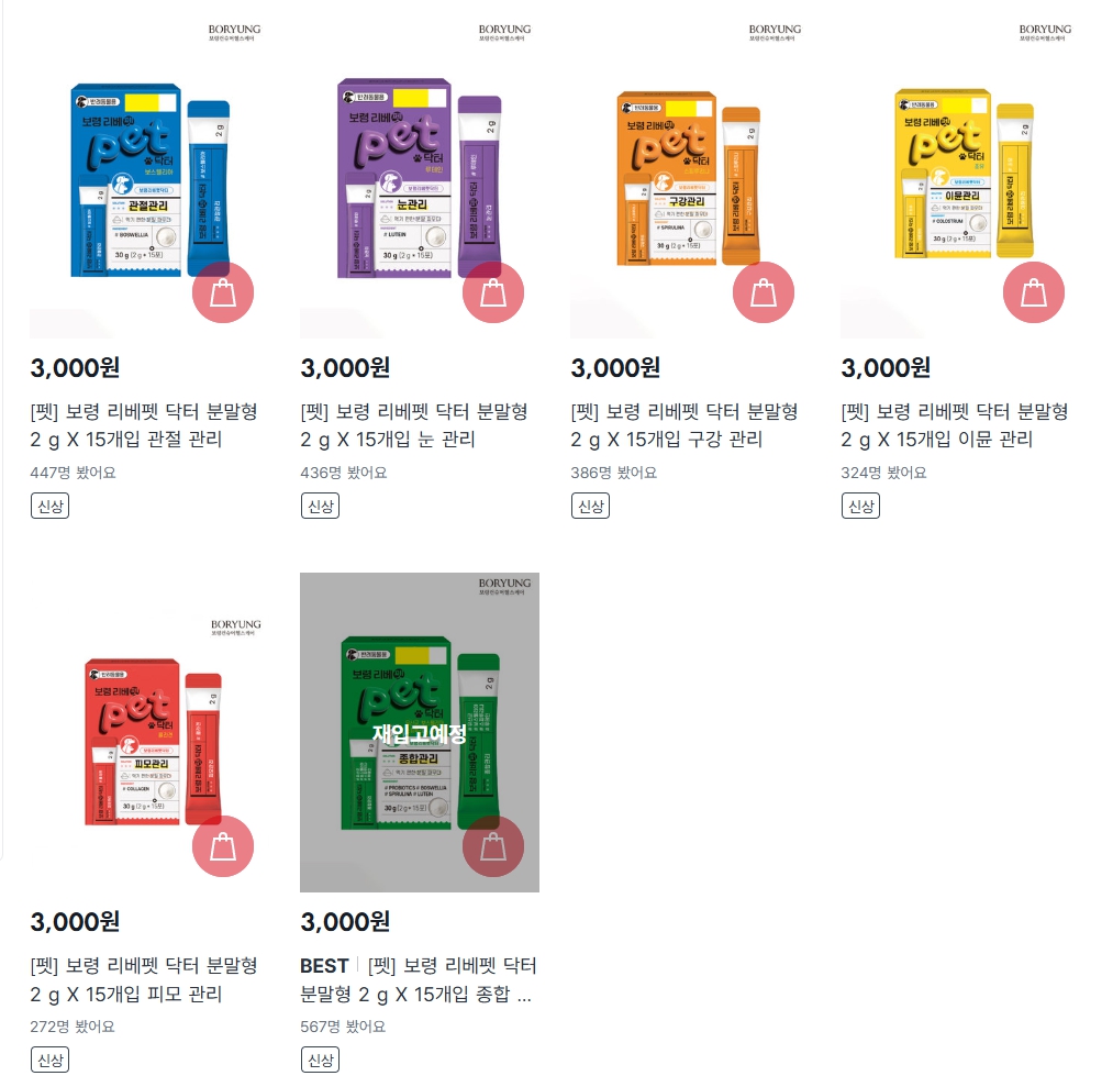 - 종류 : 종합 건강, 관절, 눈, 피모, 면역, 구강 건강 등 총 6종