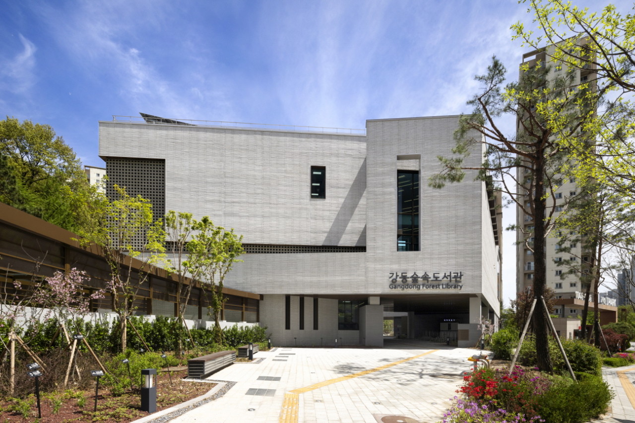 테니스장 부지를 재활용하고 산림 훼손을 최소화해 지어진 친환경 건축물인 강동숲속도서관은,