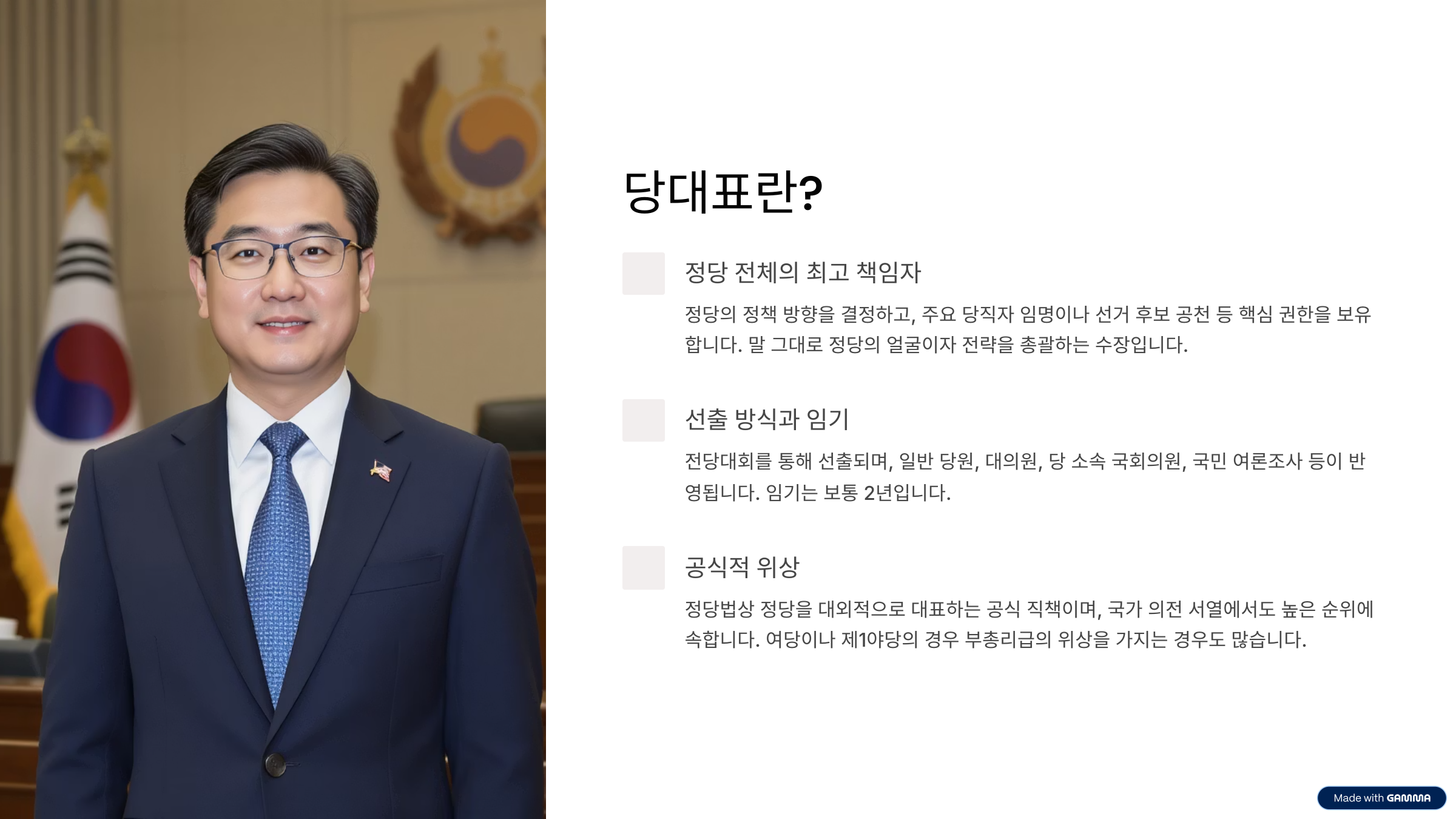 - 당대표는 정당 전체를 대표하는 최고 지도자이며, 정책과 전략을 결정하는 핵심 인물입니다.
