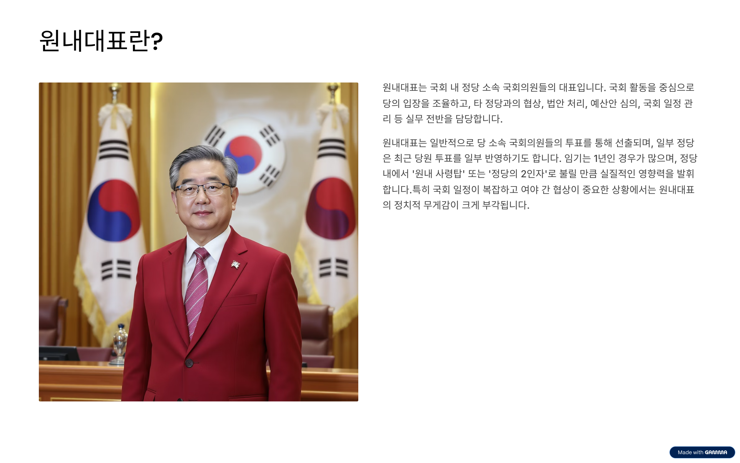 - 원내대표는 국회 내에서 당 소속 의원들을 대표하며, 실질적인 입법 활동과 정치 협상을 주도합니다.