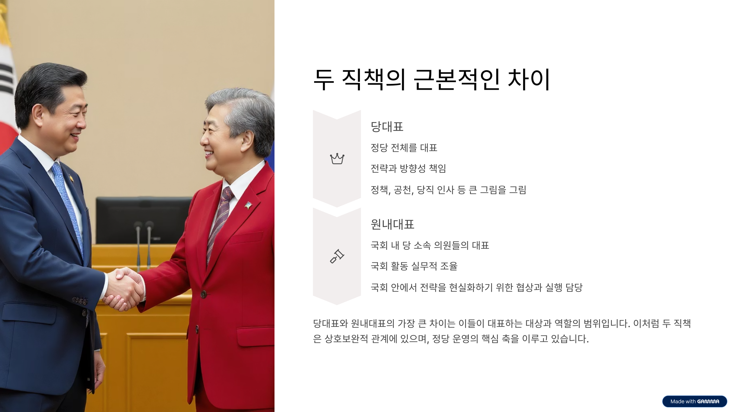 이 두 직책의 차이를 이해하는 것은 정치를 바라보는 안목을 키우는 데 있어 매우 유익한 기준점이 될 것입니다.