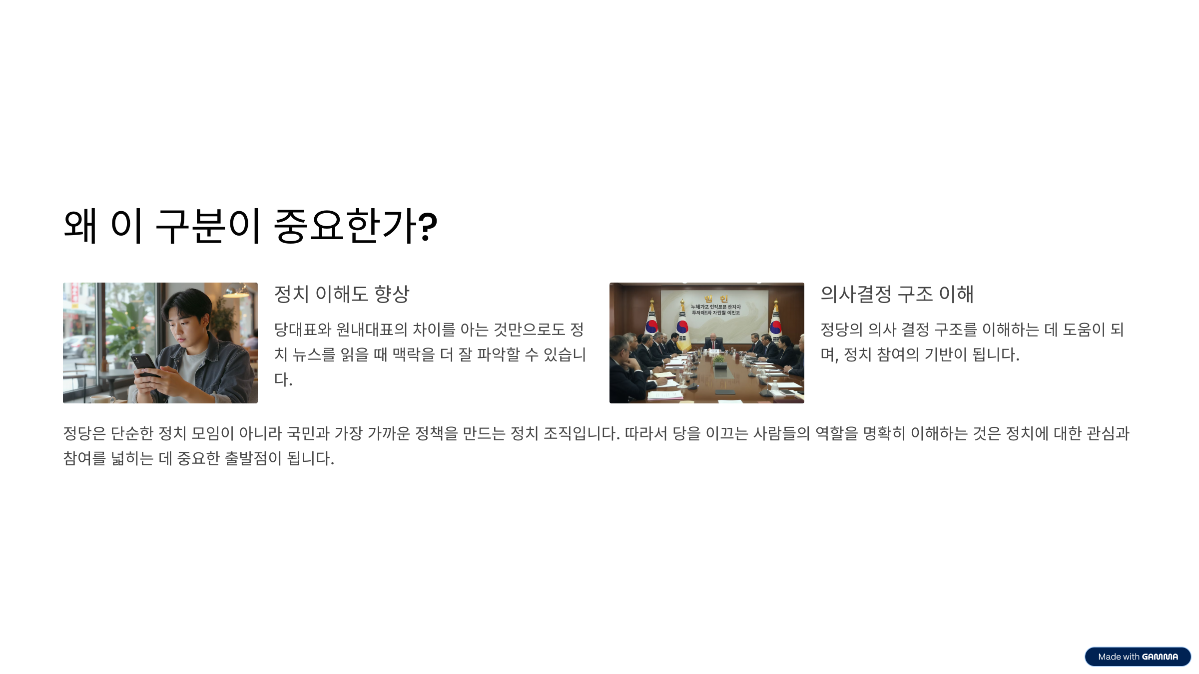 - 당대표는 정당 전체를 대표하는 최고 지도자이며, 정책과 전략을 결정하는 핵심 인물입니다.
