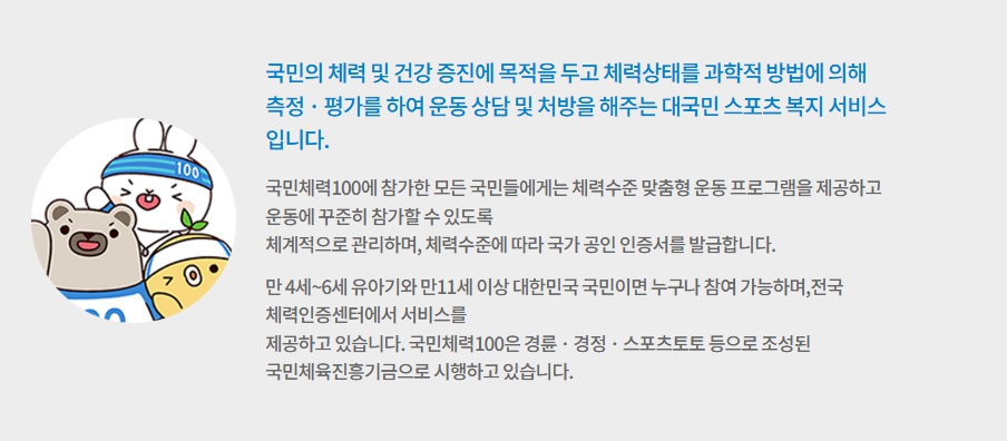 국민체력100은 국민체육진흥공단이 주관하는 무료 체력측정 및 운동처방 프로그램입니다.