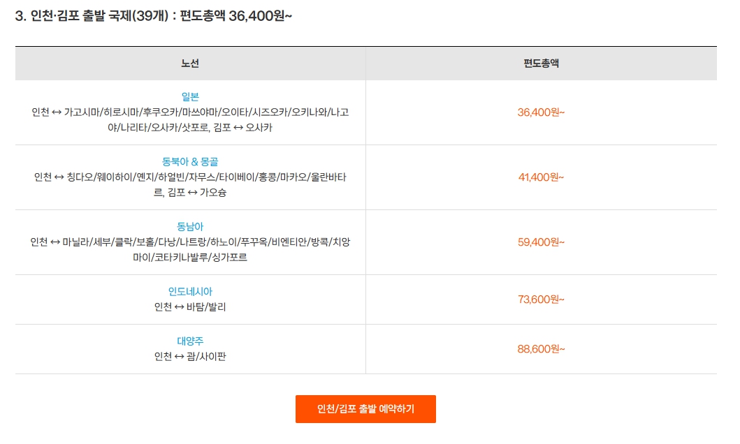이벤트 페이지에서 노선별 특가 확인 가능