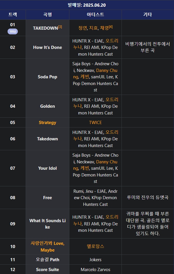 헌트릭스(Huntrix) : 주인공 걸그룹 (루미, 미라, 조이)가 데몬 헌터라는 이중생활
