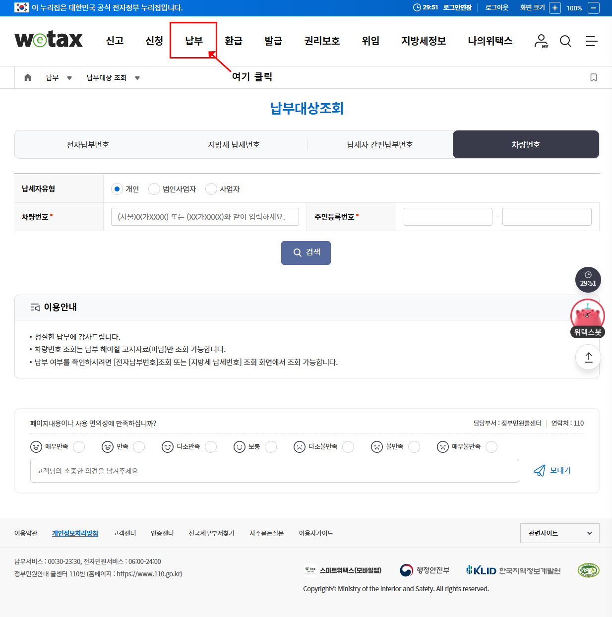 - [조회납부] > [지방세 조회/납부] > [자동차세] 클릭