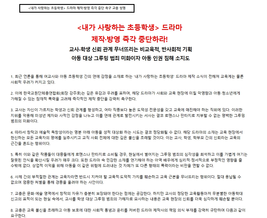 한국교총(한국교원단체총연합회)은 성명서를 통해