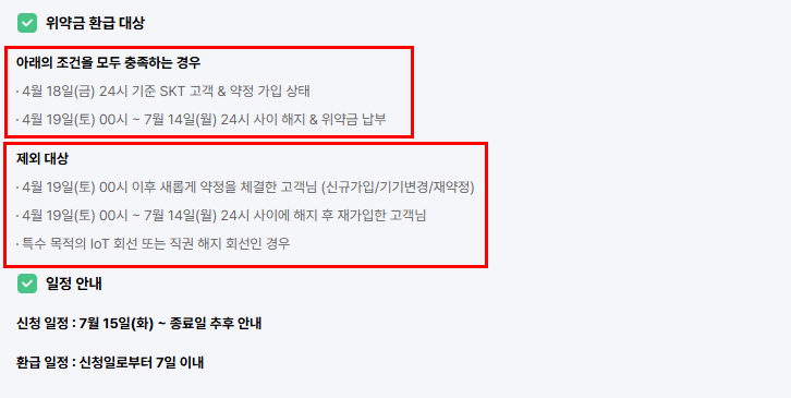 | 대상자 | 4월 18일 약정 가입자 + 4월 19일~7월 14일 해지 & 위약금 납부 고객 |