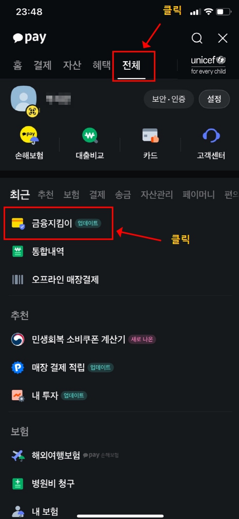 4. 카카오페이에서 전체를 클릭하시고 오른쪽 위에 돋보기로 검색 또는 금융지킴이를 찾으신 후 클릭