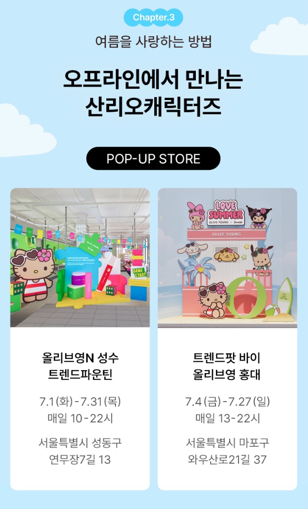 2025 여름,  여름을 사랑하는 산리오 캐릭터가 올리브영에 놀러 왔습니다.