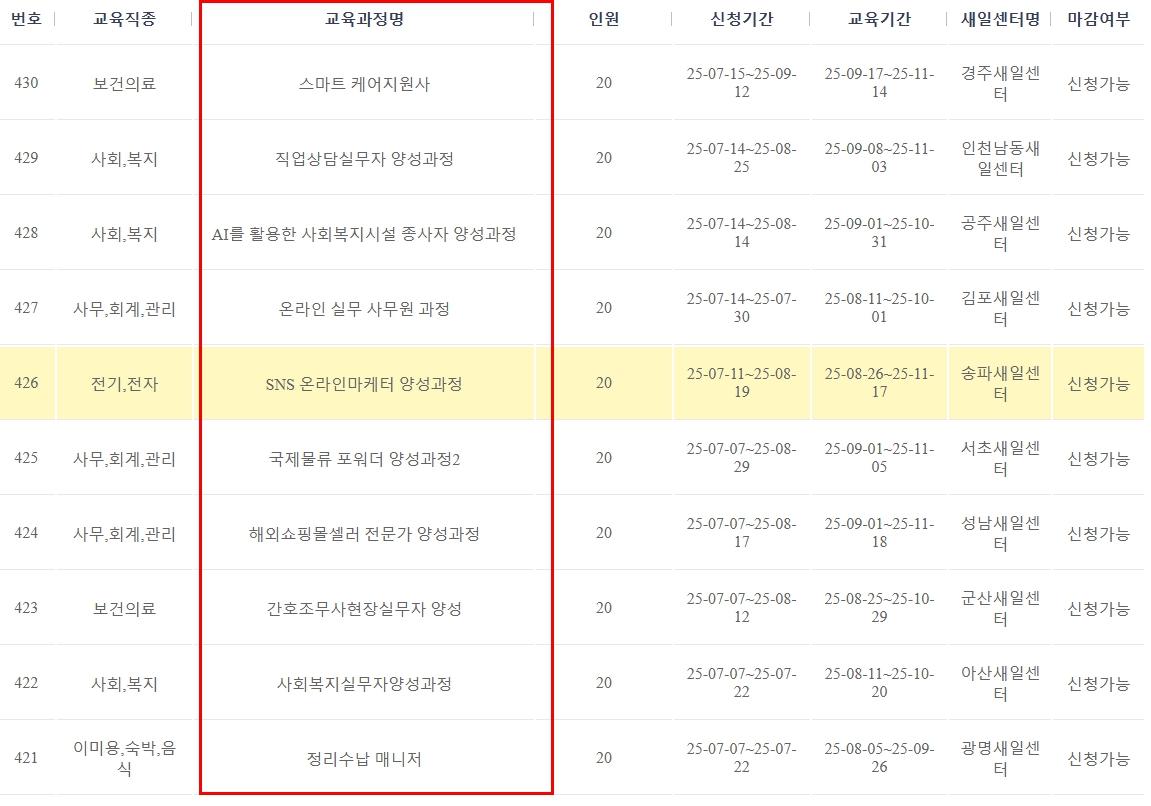 - 온라인 : 새일e직업훈련센터 통해 비대면 수강 가능