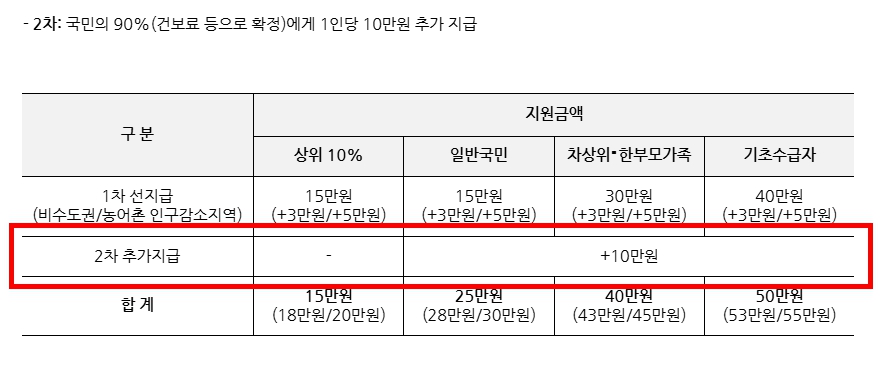 - 복지 대상자(기초수급, 차상위, 한부모)는 1차에서 더 받은 바 있으나, 2차에서는 모두 동일하게 10만 원 추가