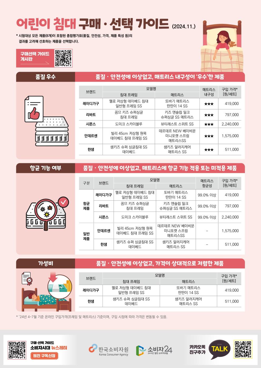 한국소비자원이 시중에서 유통 중인 8개 주요 브랜드의 어린이 침대 매트리스와 프레임을 시험평가한 결과,