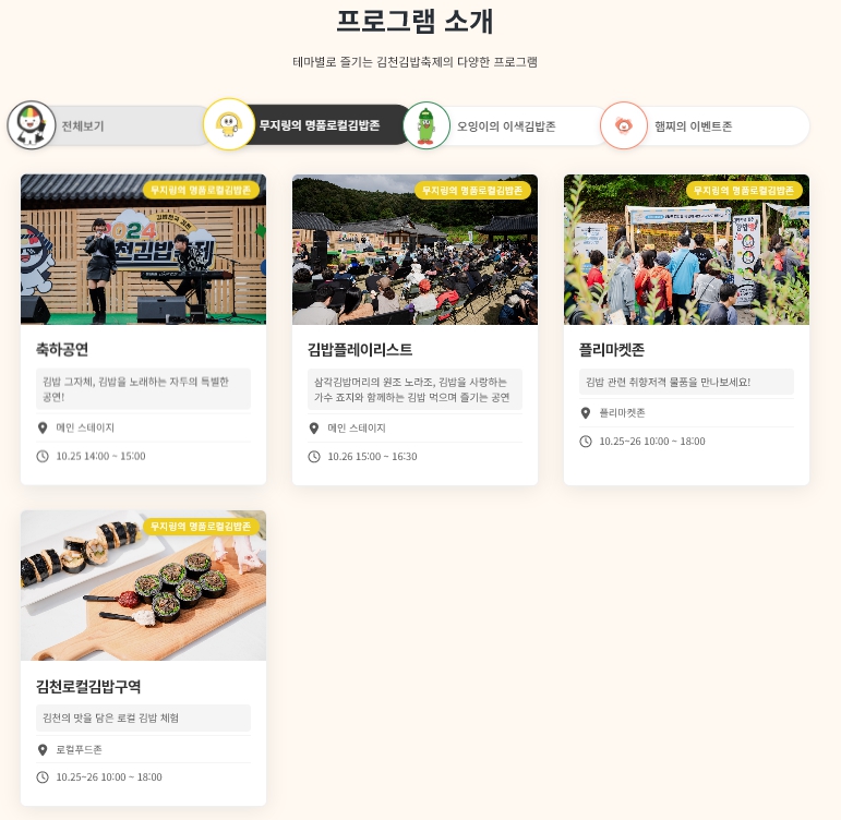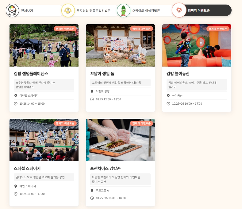 - 체험존 & 전시관 : 김밥 만들기, 캐릭터 김밥 디자인, 아트 김밥 전시