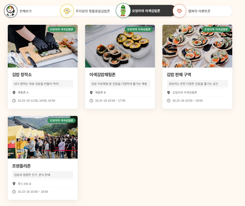 - 체험존 & 전시관 : 김밥 만들기, 캐릭터 김밥 디자인, 아트 김밥 전시