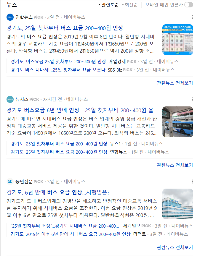 • 경기도 시내버스: 일반형 기준 1,450원 → 1,650원