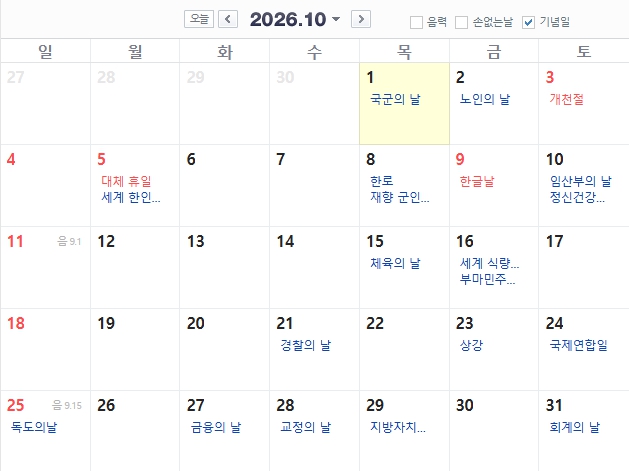 - 3일(토) : 개천절 → 5일(월) 대체공휴일 지정