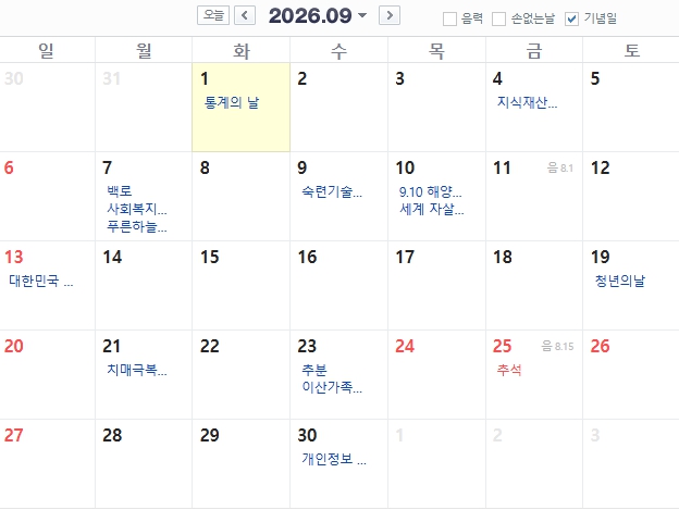 - 연차 전략 : 9월 23일(수), 28일(월) 중 하루 연차로 장기휴가 구성 가능
