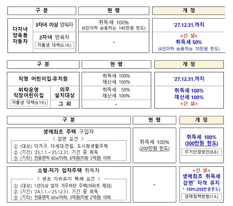 기존에 3자녀 이상 가구에만 적용되던 자동차 취득세 100% 면제는 그대로 유지되며, 이러한 혜택은 앞으로 3년 동안 제공될 예정입니다.