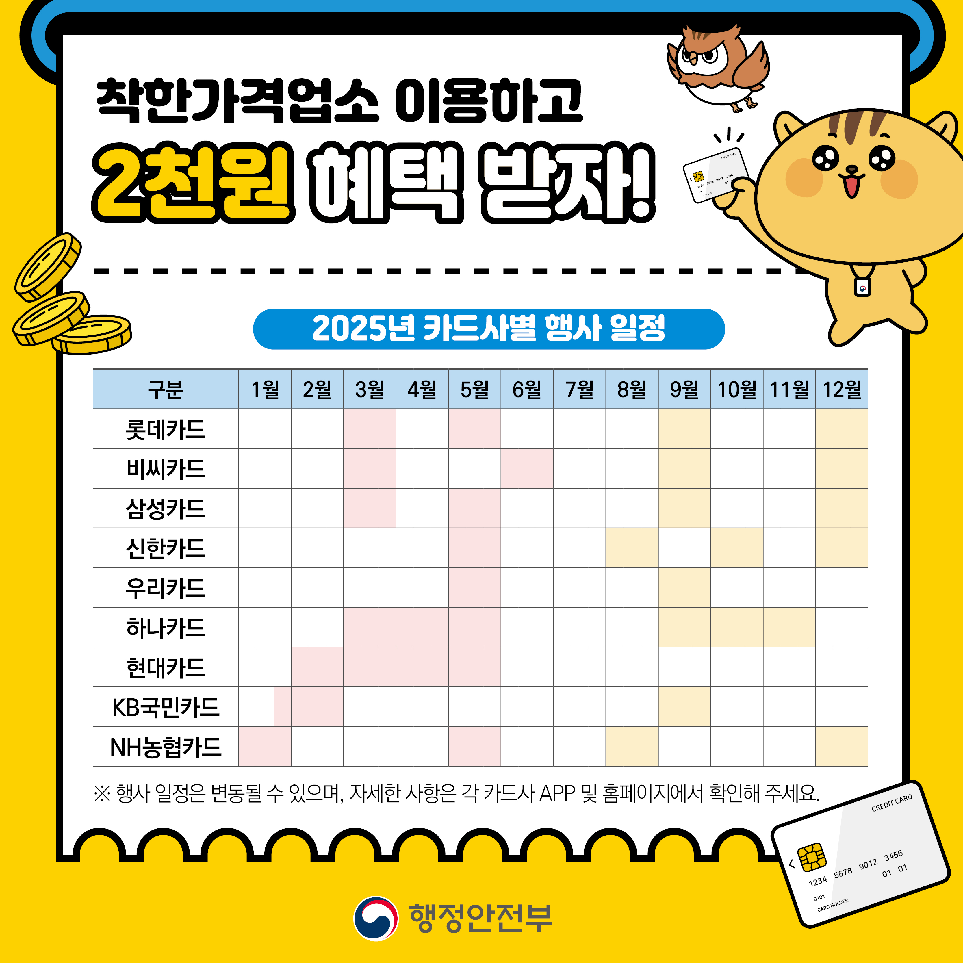 착한가격업소를 더욱 저렴하게 이용할 수 있도록 카드사별 할인 이벤트도 진행됩니다.