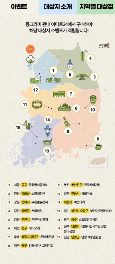이번 스탬프 투어는 ‘로컬100’ 가운데 15곳을 선정하여 이마트24와 연계하여 진행됩니다.